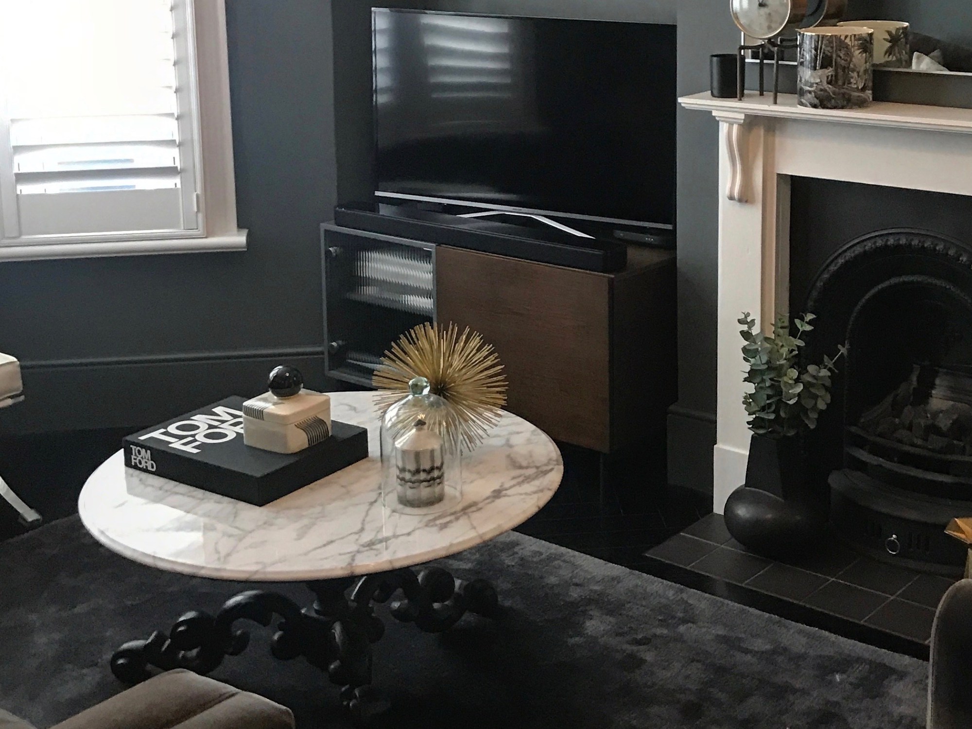 Our style is contemporary with a nod to mid-century modern. I love dark interiors, so most of the rooms are painted in dark colours using Dulux, (Urban Obsession), Farrow and Ball (Railings and Downpipe).