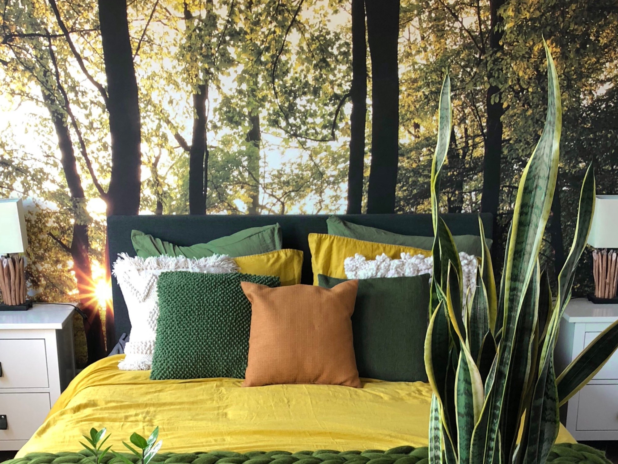 Bedroom: The first thing I bought for our bedroom was the wallpaper with a forest print. I loved the idea of waking up in a forest-themed bedroom. I ordered it online from wallprints.com and it was quite easy to put up on the wall.
